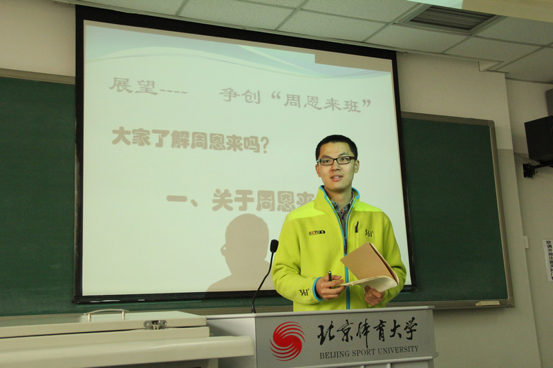 3月13日上午,体育传媒系2012级2班在教学楼307教室开展了“学雷锋活动月”主题班会活动。这一活动适逢体育传媒系创建“周恩来班”的过程中,因此班会的开始由班委们向同学们介绍了周恩来总理的伟大精神和“周恩来班”的相关情况。