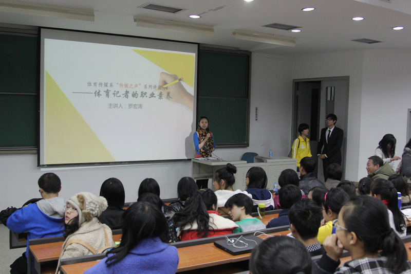2013年11月11日晚上7点30分,在315教室举行了“传媒之声”系列讲座,本次主讲人是来自中央电视台体育频道主持人、知名记者罗宏涛。许多同学都慕名而来,教室内座无虚席,体育传媒系系主任张玉田老师、助管冯瑶也来到现场与同学们一同聆听。本次讲座也作为2013级新闻专业同学的入学教育一讲,知名媒体人的传经授道,也为2013级新生专业教育打开了一扇别开生面的窗口。