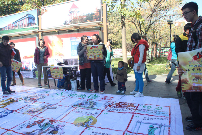 中午11点30分,活动准时开始。系团总支学生会志愿者部的工作人员有的拿着海报宣传,吸引过往人群的注意,有的在活动地点摆上农民工版的飞行棋供过往的同学玩耍,这份飞行棋为整个活动增添了很多趣味性,大家也在玩游戏的同时在图纸中了解到农民工的辛苦。不一会儿,活动吸引了很多人,有捐赠衣物的爱心同学,也有开心玩游戏的同学,现场好不热闹。