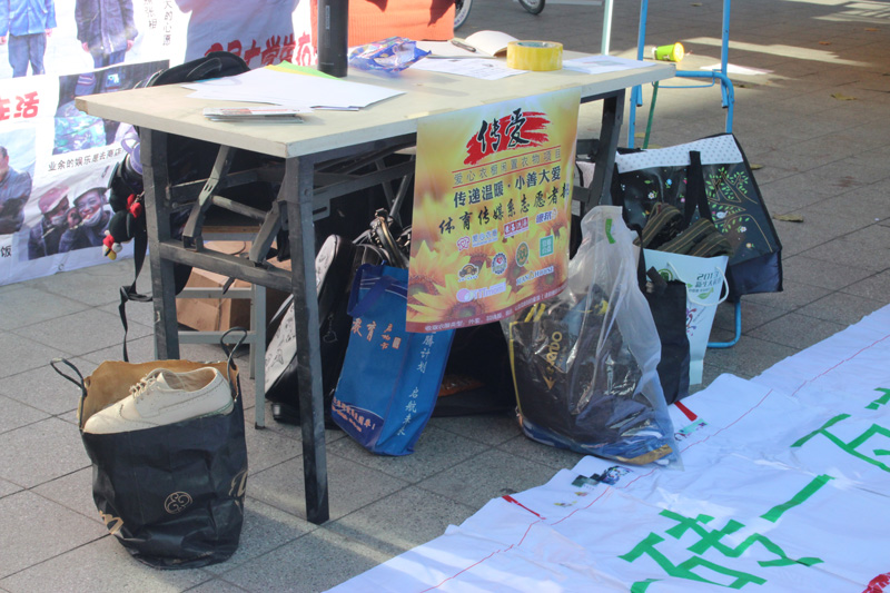 随着活动的进行,现场的气氛越来越融洽,前来参与活动的同学也越来越多。许多同学陆续送来了自己的闲置物品,有衣服、杯子、杂志和鞋子等等。我们的工作人员表示此次活动会将衣物的去向告知他们,捐献衣物的同学们也留下了自己的联系方式。还有很多同学表示,回去后会整理好闲置衣物,明天中午送到活动现场。