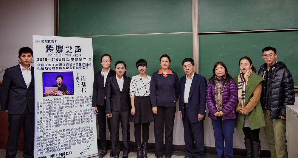 2015年11月18日晚7点,新华社体育部主任许基仁作为“传媒之声”系列讲座的特邀主讲人,在教学楼214教室进行了一场主题为”新媒体背景下的体育新闻报道趋势以及体育记者的职业素养”的专题讲座。传媒系党总支书记蔡文菊老师与传媒系副主任毕雪梅老师、及系办公室老师出席了本次讲座。