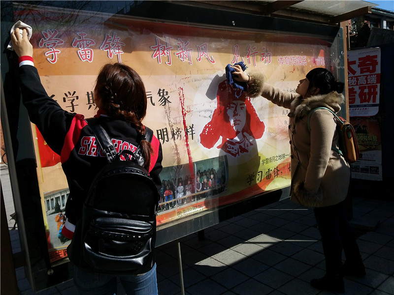 活动进行中,大家团结协作,互帮互助,将自己的热情投入到整洁校园环境中去。打扫地面,擦拭门窗,整理收纳,样样井井有条的进行。同时,体育传媒系系主任张玉田老师也热情的加入我们的行列,同学生一道打水拖地,参与劳动。在大家的团体劳作下,窗明几净,橱窗在阳光的照射下显得格外干净……同学们做的虽然只是一些简单的擦窗户、扫地、清理桌子柜子等力所能及的小事,但从这些事中展现出的是传媒系11级4班同学们强大的班级凝聚力;同时,在热情服务中,同学也切身体会并深刻理解了“奉献、友爱、互助、进步”的雷锋精神。也体会到了争创“周恩来班”的班级建设活动的意义。