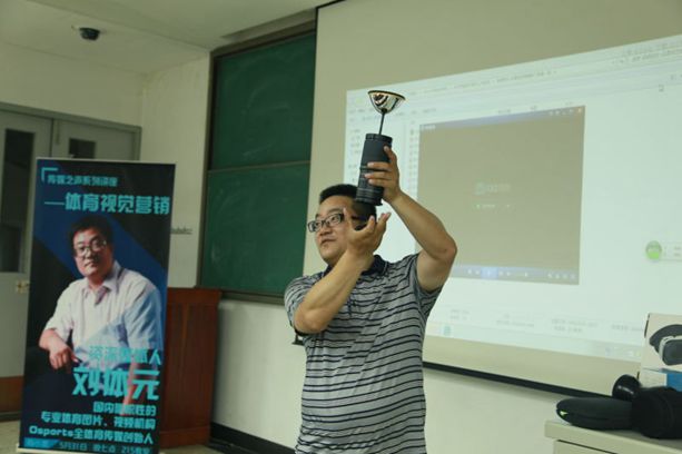 讲座伊始,刘体元老师首先向同学们发问,什么是体育视觉营销。随后,他从体育,视觉,营销,三个方面进行了解释。他将体育分为大众体育,竞技体育,学校体育,并介绍了现在体育赛事或活动的大致运营结构。在视觉方面,他以osport的技术为例告诉同学们,视觉不仅仅是图片和视频,还包括图表,漫画,数据,树懒慢镜头,blinkphoto闪图,360视觉营销,vr和ar等技术与形式。随后,他从自媒体传播,大众传播,新媒体传播等方面描述了营销的媒介和方式。