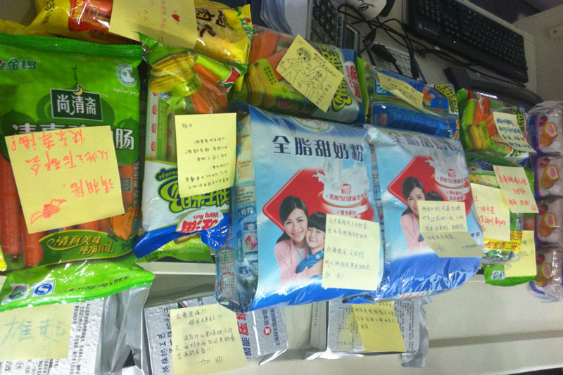 雅安地震后,11级多名同学表达了希望通过捐物的方式贡献力量的想法。但由于个人力量有限,年级决定汇集同学们的爱心,统一捐赠物资。通过统一捐赠活动,全年级同学及辅导员共募捐用于购买物资的善款630余元。4月24日,2011级辅导员卢雪老师与几位同学生代表一起,用募捐所得购买了卫生纸、女士用品、消毒用品、方便食品、回民食物、奶粉等灾区急需物资若干。在4月25召开的年级会上,还为同学们准备了小卡片和便利贴,2011级的同学们纷纷在卡片上写下对四川人民的安慰和祝福, 并将寄语卡片贴在捐赠物资上,一起打包。