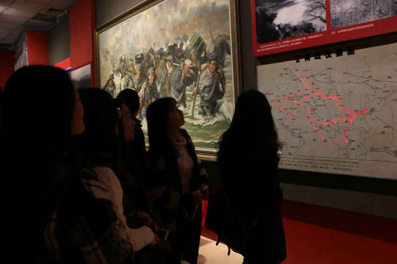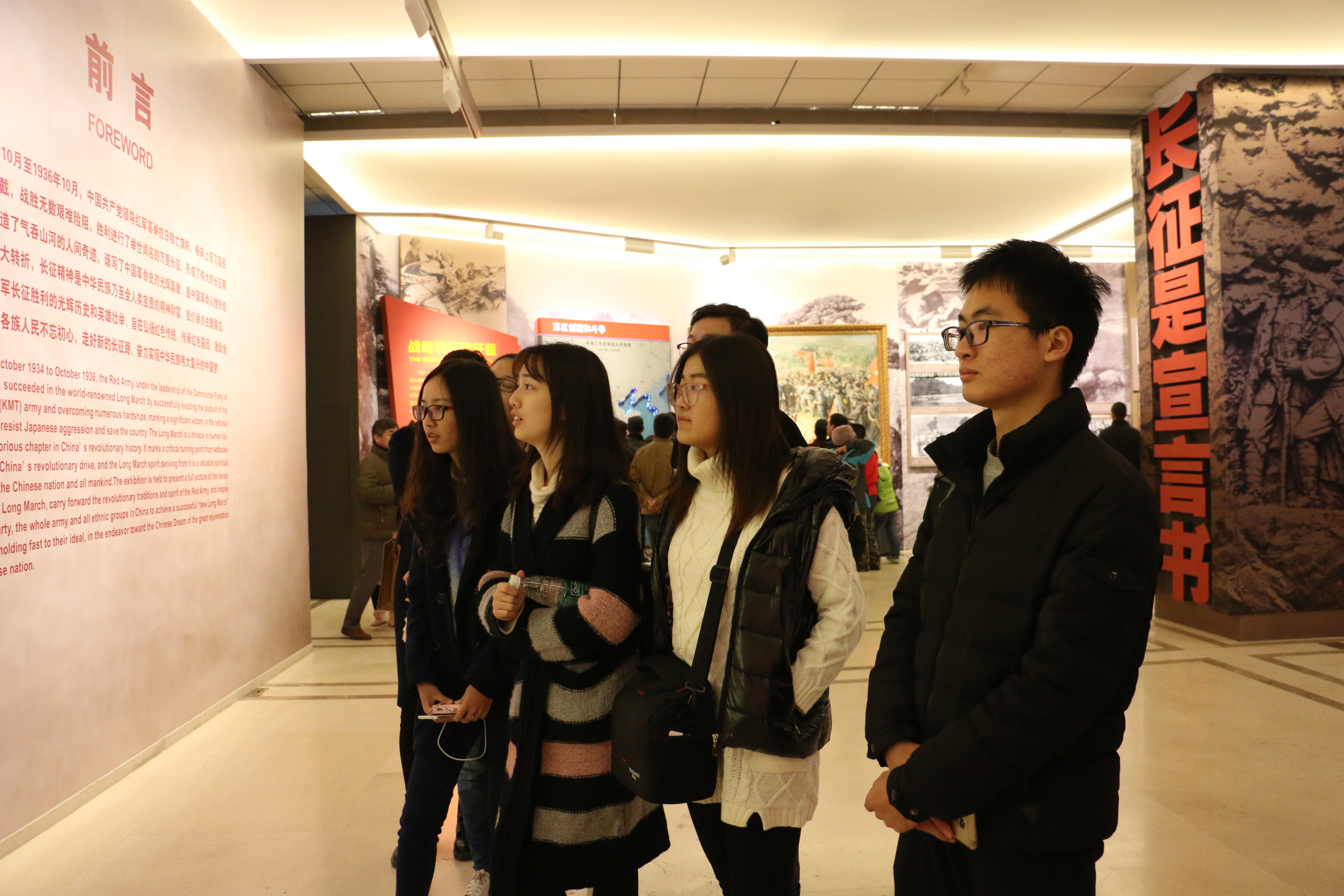 军事博物馆门前参观的队伍排起了一条长龙,现场气氛热烈,大家怀着崇敬的心情走进展厅,接受革命前辈的精神洗礼。整个展厅全面而又深刻地介绍了红军长征的起因、经过和结果,这种真实而又伟大的革命精神深深震撼了在场参观的每一位同学,同时也让同学们对以往所学的、所听的有了更进一步更直观更深刻的理解。其中,四渡赤水,爬雪山,过草地等一系列英雄事迹生动而又形象的通过图片、文字、影像和雕塑的方式展现在了同学们的面前,还有很多历史遗留下来的珍贵文物陈列其中,展厅内一件件珍贵的实物,一幅幅场景油画都给人们以巨大的震撼,把人们的思绪带入了80年前的瑞金、遵义、大渡河、金沙江、雪山草地、吴起镇。80年前,在生死存亡的紧急关头,中国共产党领导工农红军历经艰苦卓绝的两万五千里长征,在陕甘宁地区胜利会师,把濒临绝境的中国革命引向坦途。