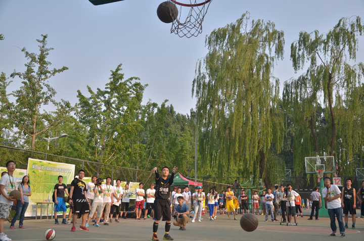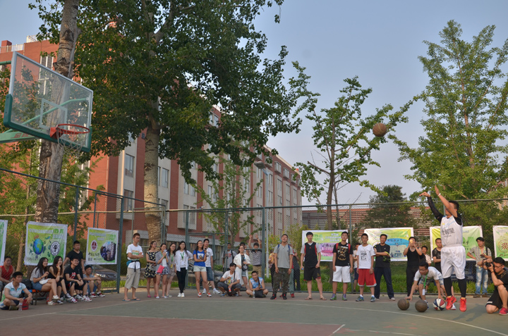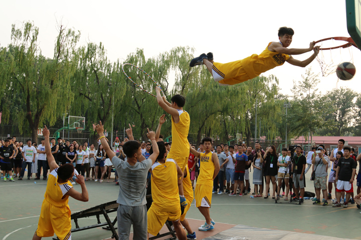 这之后,北体大的JS花式篮球协会的社员们为我们献上了精彩的花式篮球表演。他们借助弹力板为我们表现了一个又一个精彩的扣篮。先是大风车,胯下换手、打板接球、背身拉杆、空中转体360度的个人表演。之后进入到队员间配合的阶段,从两人配合、三人配合,再到最后的四人配合,更是看到了精彩的空中转体反C的表演。观众朋友们毫不吝惜的为他们献上掌声,场边也是连连赞叹,欢笑不断。随后,黑队11号骑在白队9号肩上,篮球社员借助弹力板,一记飞扣跨越这座高山将球扣进,好棒!瞬间让我们想到了2000年悉尼奥运会美国“梦之队”卡特飞跃法国高山的惊世一扣。最后,篮球社为我们献上了压轴表演,四人配合,最后一名同学从呼啦圈中飞出将球扣进。太赞了!场边响起了经久不息的掌声,大家纷纷表示着对他们表演的赞叹和惊讶。