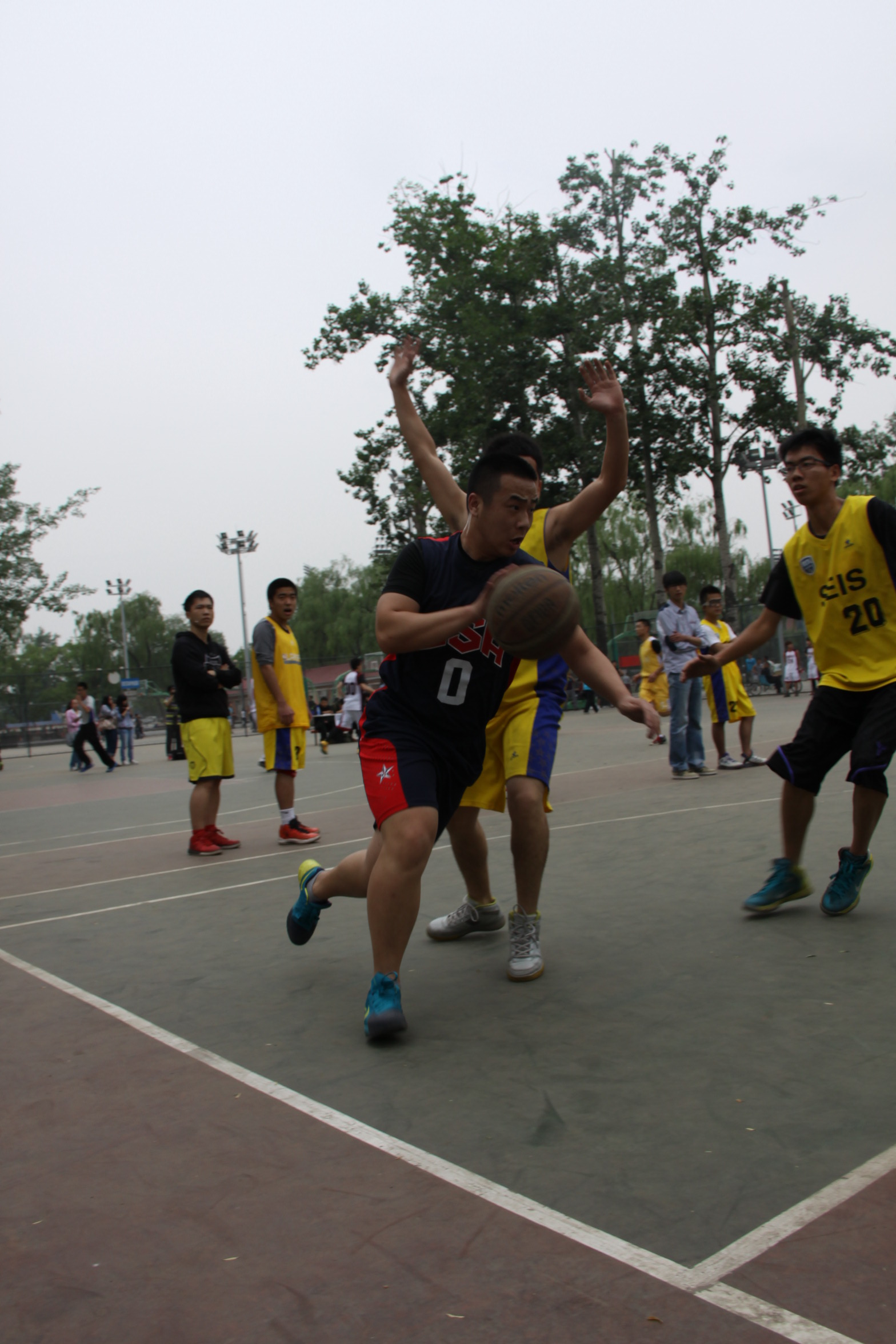 比赛一开始,双方均采取区域联防的防守战术,效果明显,开场两分钟后才由中传1号林秉寰抓住机会突入禁区,为比赛首开纪录。北外13号郭诚与20号严林以一个漂亮的全场长传配合得分予以回应。随后中传队长0号郑派开始发威,先是一个3分入网瞬间提升队伍气势,而后连续两个回合的中投命中带领队伍打出7比0的小高潮。反观北外5号赵磊半场线附近强势地断球吹响北外追分的号角。先是13号郭诚强突内线面对四人包夹挣得罚篮且两罚全中,而后,5号赵磊连得六分,将比分追至20:20平。这时中传1号林秉寰展现出卓越的突破能力,内线得分。此后双方均加强防守,遏制了对手的命中率,直至半场快结束时,中传6号任豪健以一个自抢自投的得分打破僵局并让中传以25:20的优势进入下半场。