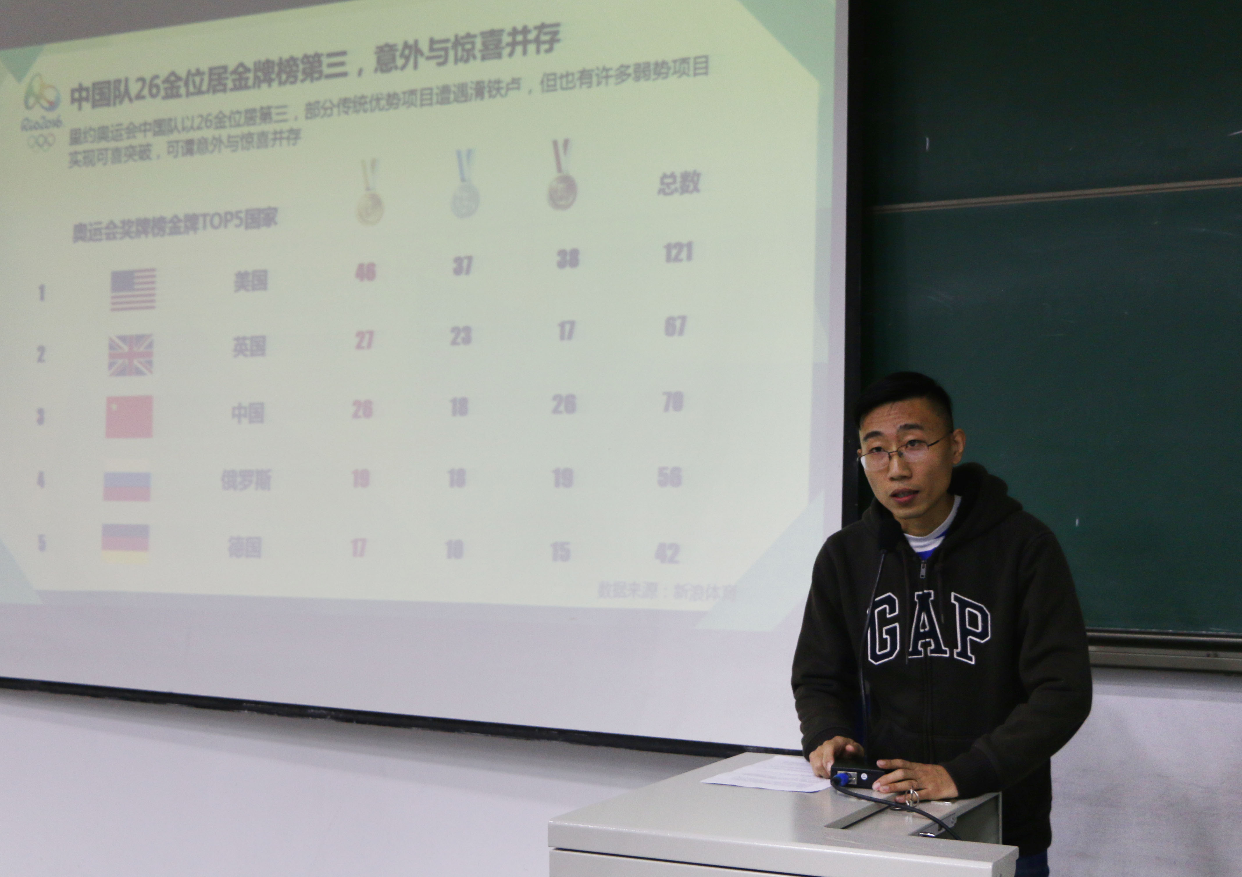 曾磊师兄本次讲座的主题是“央视里约奥运会报道的策略分析以及体育电视编导的基本素养”。讲座开始,曾磊师兄先向同学们抛出了几个问题,并由问题切入到讲座的第一部分——报道一场大型赛事的策略分析。以本次报道里约奥运会为例,曾师兄从四个方面介绍了央视为成功转播本届奥运会所做的策划。