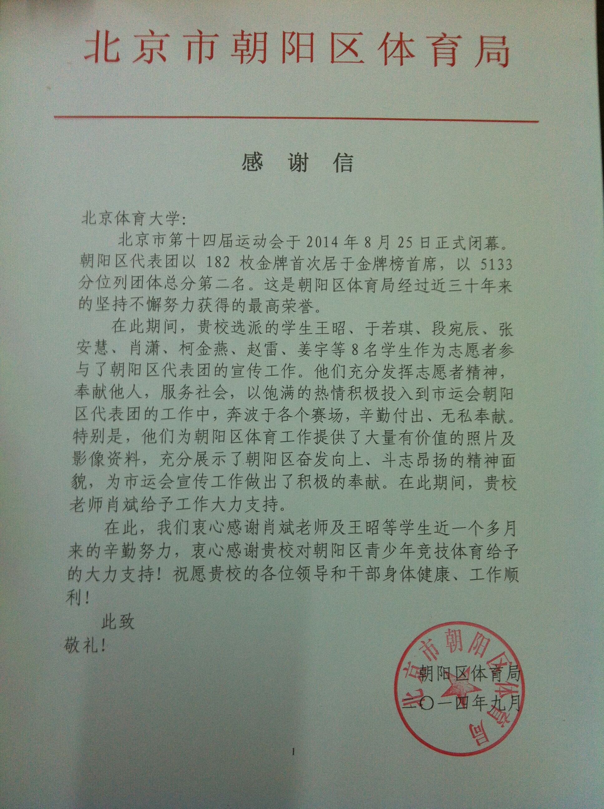 开学初始,体育传媒系便收到了来自朝阳区体育局的感谢信,虽然信的内容很简短,但从中依然可以感受到朝阳区体育局对北体传媒学子的高度肯定和赞赏之情。这封感谢信不仅是对这八位同学工作的肯定,更是对全传媒系学子的一种鼓励与敦促。而全体学生也表示,如果有机会,以后也会积极参与到这样有意义的志愿服务活动。