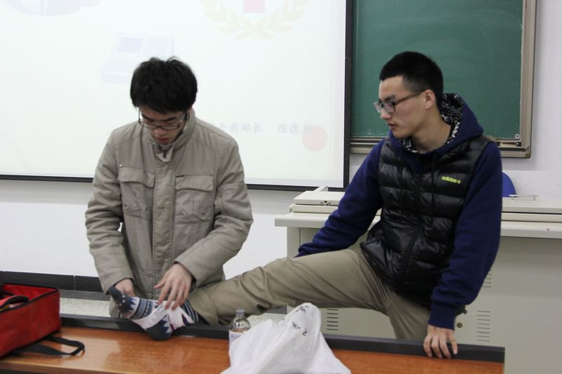校红十字会前急救部部长陈德龙受邀为五环之星的志愿者普及急救常识。急救常识的讲解是从一个急救箱开始的,陈德龙打开急救箱,小小的急救箱可谓“麻雀虽小,五脏俱全”,其中包涵了包括毛毯,棉签,绷带,夹板等五花八门的急救物品。陈德龙将其一一取出并分别介绍了他们的功能。在对绷带的使用进行讲解时,为了使现场的志愿者们能够更好的了解绷带的包扎手法,他在邀请了一位志愿者进行了现场展示。最后他提醒同学们进行急救时一定要小心谨慎,不然容易造成二次伤害。陈德龙同学丰富的急救知识和经验使接受培训的志愿者们叹服,同时他们也感谢陈德龙同学详尽的讲解。