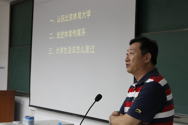 张玉田老师首先向同学们介绍了北京体育大学的变迁与发展,北京体育大学由最初用平板车运送教学物资,师生们共同一砖一瓦的建设到现在已经经历了六十个年头,如今北京体育大学占地1300余亩,是全国重点大学,“211工程”院校。接下来,他向同学们介绍了体育传媒系的概况,从师资力量、课程设置、学籍管理、教学设施、就业去向五个方面详细讲述了体育传媒系的发展与现状。最后,张玉田老师结合体育传媒系往年的就业情况就“大学生活应该怎么度过”表达了自己的对2013级新生的期望与祝愿,他认为同学们应明确自己的目标与定位,平衡学习与生活,不光要学会做学问,更要学会做人。 他结合自己的经验与同学们分享了自己的生活态度:1、凡事必须提早,2、对事物充满好奇,3、不要模仿别人,4、选择适合自己的朋友,5、学会照顾自己,6、把握乐观心态。他劝诫同学们:“机会只留给有准备的人。”
