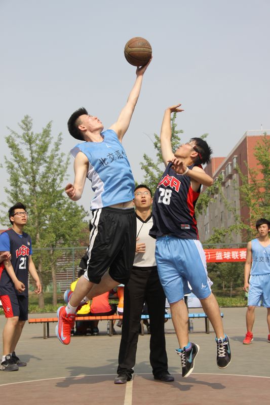 下午3点,两场比赛同时进行:民大率先抢到球权,北外势头强劲,一度打出9:1的小高潮。24号晏诗齐送出多次助攻,55号沈宇韬关键时刻果断传球,8号李秋实接球上篮得分。民大变被动为主动,3号蒋思遥快速抢断,一条龙上篮得分,引起场下一阵掌声。然而此时,主裁判向蒋思遥走去,给了他一个罚下的手势。蒋思遥被罚下后,场上出现4对5的局面,这意味着中央民族大学若想取得胜利将会更加艰难。11号沙海洋作为队长,用一记漂亮的上篮得分告诉队友要坚持,不能放弃。4兄弟坚守战线,没有丝毫懈怠。1号李响表现突出,多次杀进内线,抢断、贡献助攻。本场比赛最后比分55:49,民族大学惜败北外。