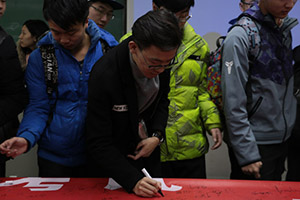第二届“周恩来班”同学们制作了“诚信考试,从我做起”的横幅,同学们纷纷在横幅上签字,承诺自觉履行诚信考试,营造良好考场环境。