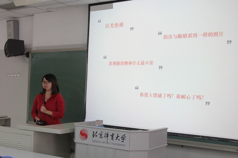 2013年11月4日中午12点15分,体育传媒系第九届团总支学生会第二次培训之摄影培训在203教室举行,此次活动由第八届团总支学生会宣传部副部长雍茜茹主讲,这场与新闻技能息息相关的培训吸引了学生会成员等诸多同学的到场。在培训正式开始之前,雍茜茹首先让到场的同学们分别在纸条上写下自己在摄影过程中存在的问题,借此了解大家对摄影的疑惑以便培训最后能够更仔细地为大家进行解答。在这一场近一个半小时的培训中,2011级雍茜茹就摄影相关知识给大家进行了全面的指导。