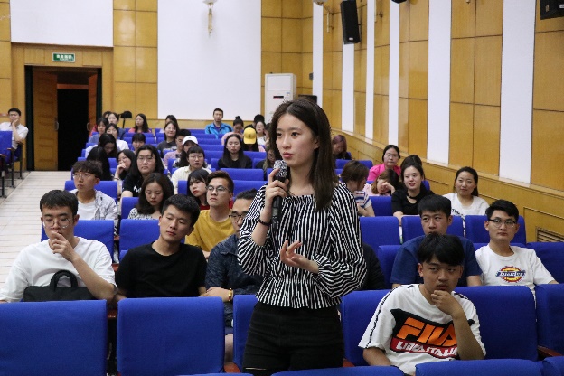分享过后的提问环节中,同学们向两位老师分别讨教。一位同学请教徐济成老师如何将自身兴趣从篮球等夏季项目转移到冬季项目上去,徐济成老师结合自己在平昌冬奥会前后的工作经历回答道:通过钻研自己的工作,并有所收获,从不断的收获中爱上冬季项目。夏松老师提到,在与体育展示相关的众多工作中,播报工作是最难、最不可以出错的。他邀请了一男一女两位同学上台进行专业尝试,并对他们的表现进行了点评和肯定。